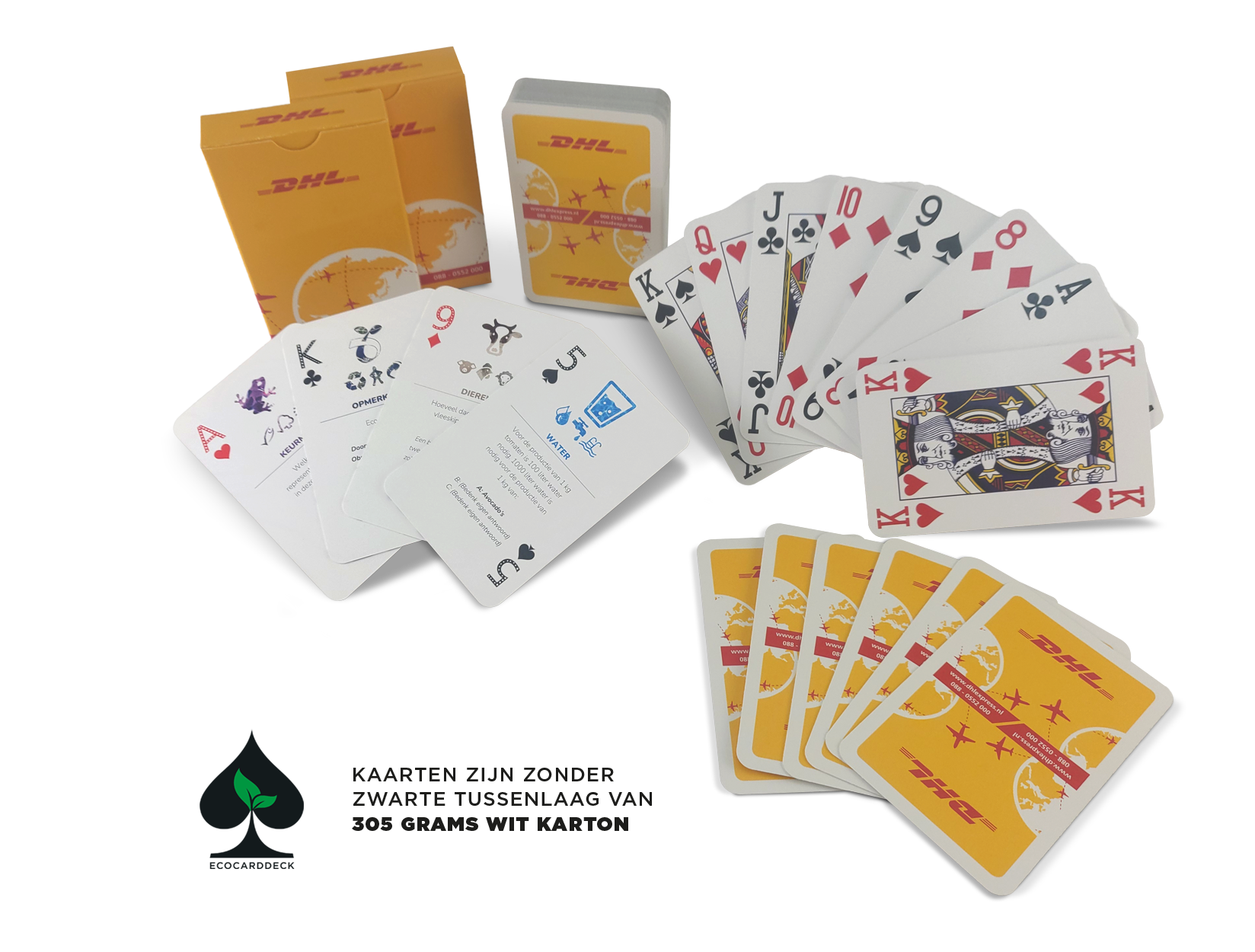 Wählen Sie Ihren eigenen Vollfarbdruck für z.B. ein Quartettspiel, ein Frage-Antwort-Spiel oder Ihr eigenes Kartenspiel, Sie können aber auch unsere Standard-Spielseiten nutzen. Das EcoCardDeck aus weißem 305-Gramm-Karton ohne schwarze Zwischenschicht besteht aus 55 Karten. Wenn Ihr Design weniger Karten hat, passen wir die Schachtel ohne zusätzliche Kosten an.